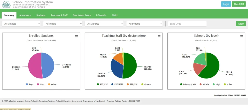 This process is managed through the School Information System (SIS), currently operated under PMIU-PESRP (accessible at https://sis.pesrp.edu.pk), which was earlier developed by the Punjab Information Technology Board (PITB).